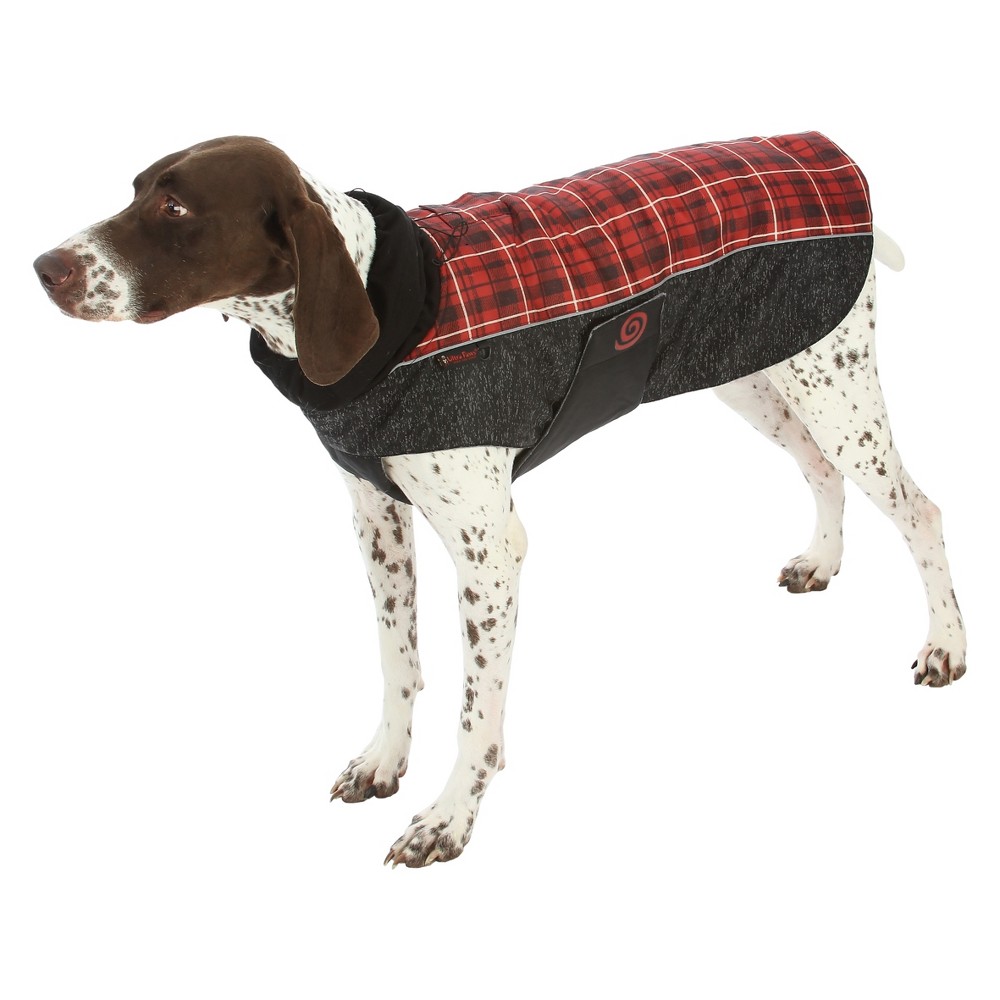 You can't beat this warm, waterproof coat. Fashionable in original fabric pattern and full reflective lower fabric panels, plus reflective piping. Eight sizes Petite - 4XL. FEATURES: Colors: Comfy Red Plaid on the back and complimenting lower panel that is fully reflective in low light conditions. Polyester outer shell with polyester fleece liner and fiber fill. Neck nylon/spandex blend. An adjustable turtle neck, generous hook and loop closures, extended chest protection and opening for leash attachment add to the features. The D-ring has been refined to add clip lights (sold separately). CARE INSTRUCTIONS: Simply pull the coat over the dog's head and adjust the hook and loop closures. Machine wash with warm water, gentle cycle. Do not bleach or dry clean. Tumble dry low. Cool iron if needed. Gender: female. Material: fleece/nylon/polyester.