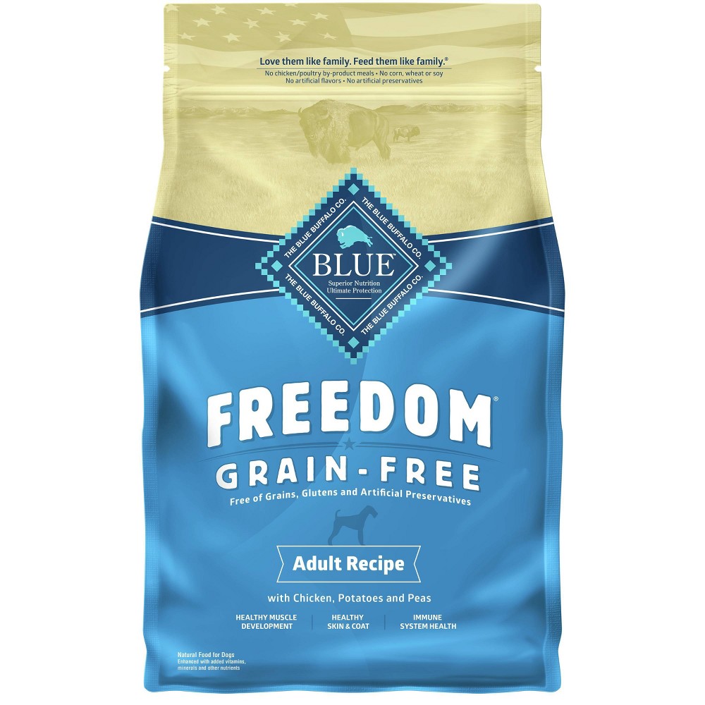 BLUE Freedom is a delicious, 100percent grain free formula that contains no gluten. All BLUE Freedom dog food recipes feature high-quality real meat with no chicken (or poultry) by-product meals. Set your dog free from grains with this tasty, satisfying diet.BLUE Freedom dog food is a product of the Blue Buffalo company. Based in the United States, Blue Buffalo makes premium-quality pet foods featuring real meat, fruit and vegetables. Size: 4lbs. Age Group: adult.