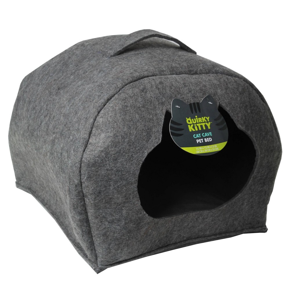 The Quirky Kitty Cave Bed is the purrfect cozy hideaway for cats to cuddle, nap, lounge, and play. This fun and modern felt cat bed features durable, high quality materials and a soft cushion inside for the ultimate snooze zone. This cuddly cave bed works great for cats of all ages and sizes. To wash spot clean with a soft cloth and warm water. Removeable cushion can be machine washed on a gentle cycle.