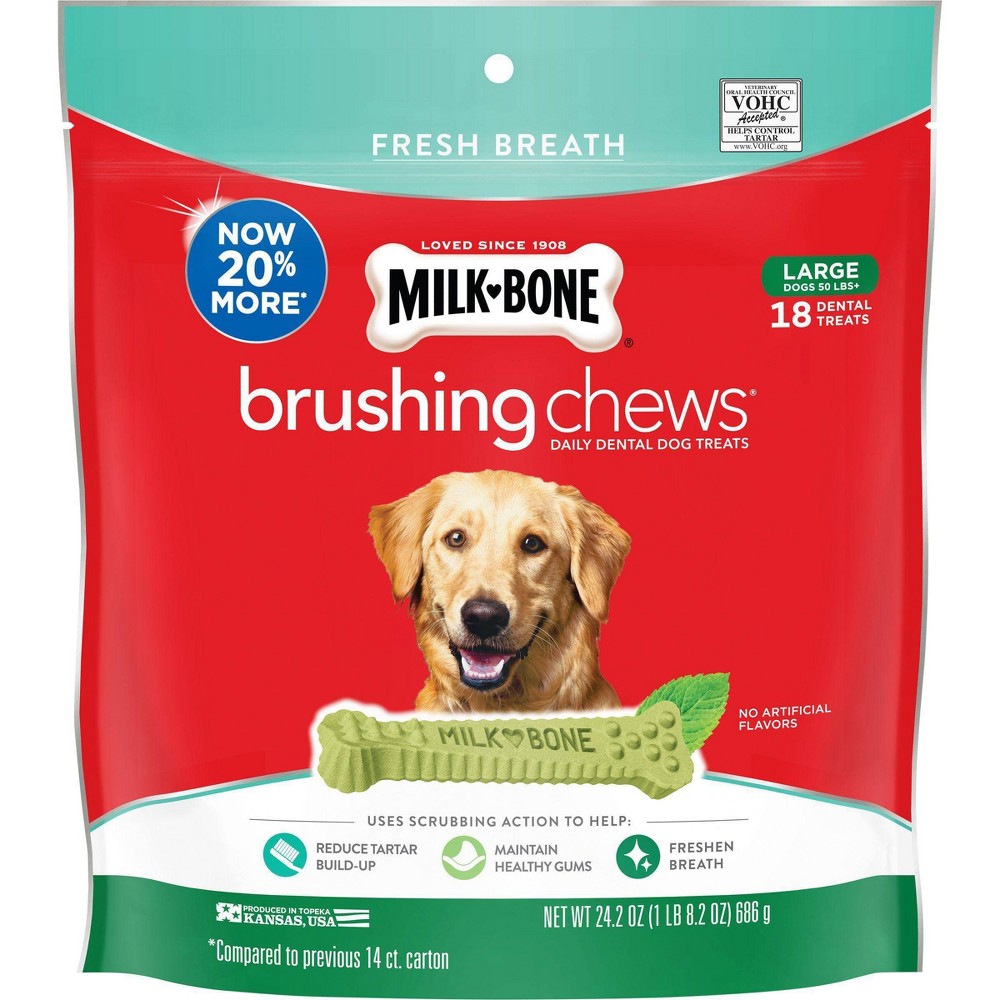 Bad breath can keep you and your dog from the closeness you've always enjoyed. Now you can help keep your canine friend's breath fresh with Milk-Bone Brushing Chews Daily Dental Treats. These chews feature unique nubs and ridges that are designed to clean like bristles on a toothbrush*, helping control tartar and plaque buildup through scrubbing action. Made with no artificial flavors and sealed for freshness, these chews have an irresistible minty taste your dog will love. They are fortified with calcium to help support strong bones and teeth-and have no artificial flavors. *When fed daily Milk-Bone Brushing Chews are as effective as brushing a dog's teeth twice a week based on the reduction of tartar build-up. The Veterinary Oral Health Council rmends daily tooth brushing for optimal effectiveness.
