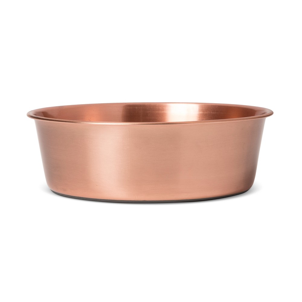 Give your lovable furry friend a functional style upgrade with the slEEK design of this Matte Cat and Dog Bowl from Boots and Barkley™. Made with sturdy and durable stainless steel for long-lasting use, this pet dish has a round design that makes eating or drinking a breeze for your furry friend. Non-skid rubber on the bottom helps keep it in place on non-carpeted floors, while the matte copper exterior pairs easily with any home decor aesthetic. Whether you use it to hold their food or water, this metal pet dish has a dishwasher-safe design for easy cleaning when needed. Loving your pet from head to tail.™ 100percent satisfaction guaranteed or your money back.