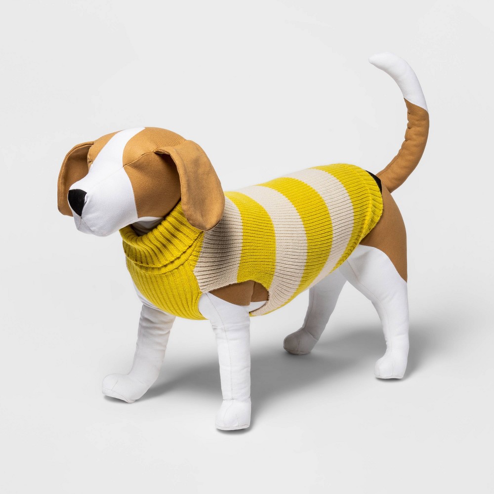 Keep your furry fashionista warm, cozy and stylish during the cold-weather months with the Dog and Cat Sweater from Boots and Barkley™. Crafted from a soft and lightweight fabric, this pet pullover is designed with a cozy sweater-knit pattern featuring horizontal bands of stripes in bright yellow and cream. It has yellow rib-knit edges and an under-the-belly panel for a flexible and snug fit, which is matched by the cozy turtleneck in coordinating yellow. With its adorable look and easy pull-on style with comfy cutouts for the front legs, your pet is sure to look cute and dapper wherever you go, from routine strolls to playing in the backyard. Loving your pet from head to tail.™ 100percent satisfaction guaranteed or your money back. Color: mustard.