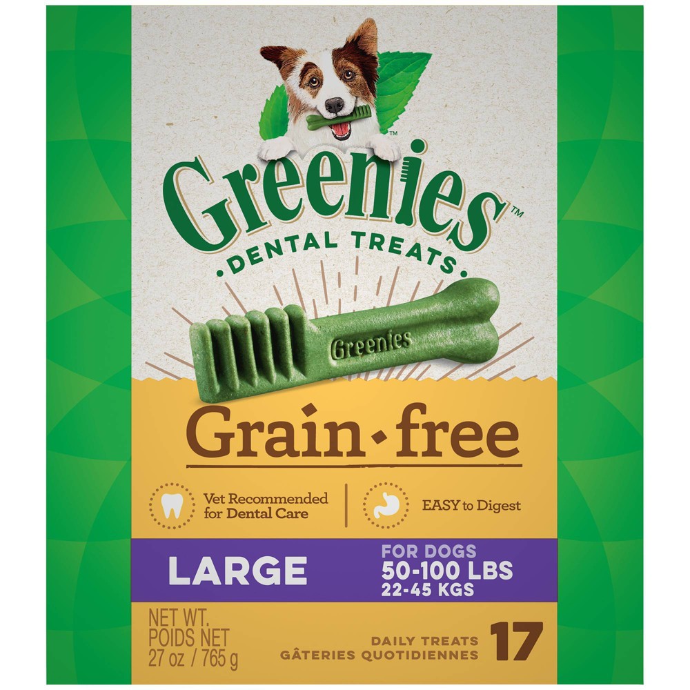 One GREENIES Grain-Free Dental Treat is all it takes for clean teeth, fresh breath, and a happy dog. Featuring dried potatoes, plus a delightfully chewy texture that fights plaque and tartar, your dog can't wait to sink their teeth into these zero-grain dog treats. Irresistibly tasty and incredibly powerful, GREENIES Treats for Dogs are vet-rmended for at-home oral health care and accepted by the VOHC (Veterinary Oral Health Council.) Best of all, these natural dental treats are made with highly soluble ingredients that are easy to digest. Give your large breeds the mouth-wowing treat that helps promote their overall health with GREENIES Dog Treats. Natural Dog Treats Plus Vitamins, Minerals, and Other Nutrients. Size: 27oz.