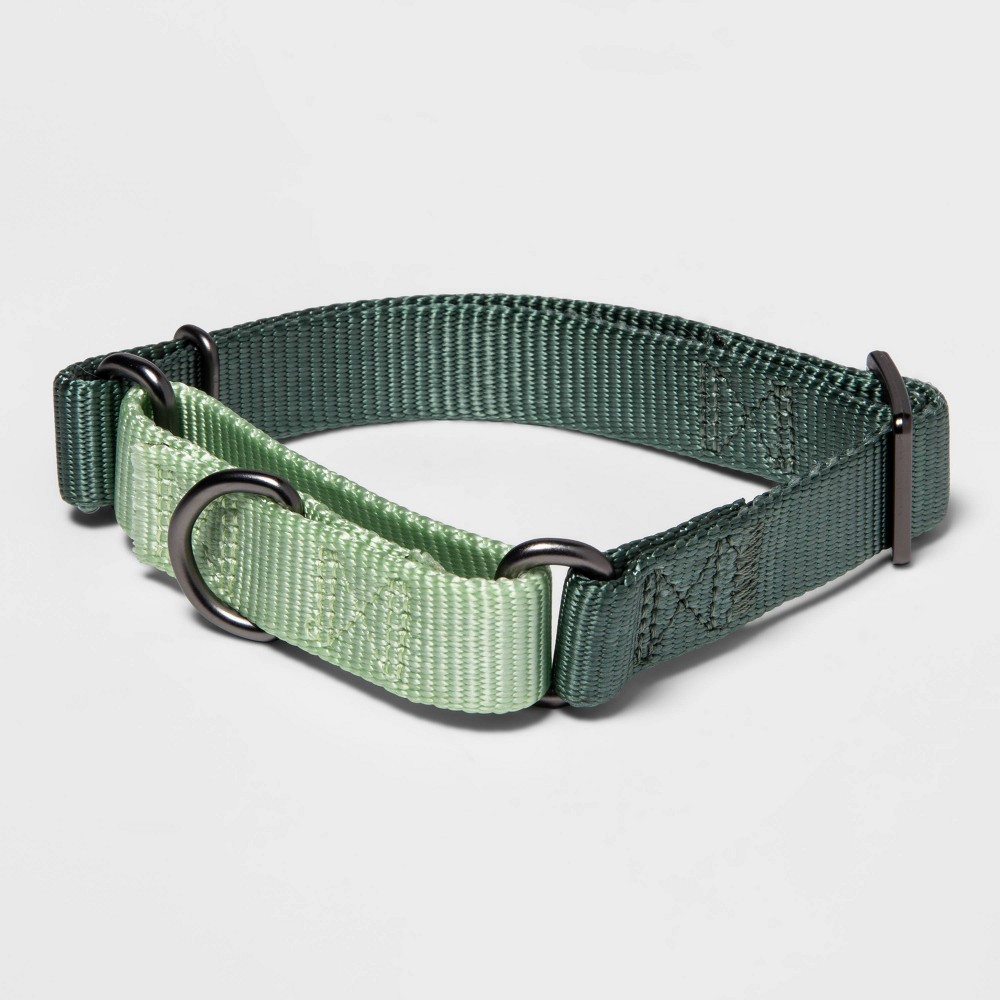 Martingale Dog Collar - : Add color and comfort to your dog's everyday style with the Martingale Dog Collar from Boots and Barkley™. Sporting a classic and durable design made with nylon webbing, this green dog collar is sure to have your pup strutting down the block in safe style. Featuring twin shades of green, this adjustable collar offers a customized fit, and it comes equipped with a gunmetal gray D-ring for attaching identification tags and a leash. Complete the spirited look with a matching dog leash, or double up the vibrant charm with a contrasting color leash. Loving your pet from head to tail.™ 100percent satisfaction guaranteed or your money back.