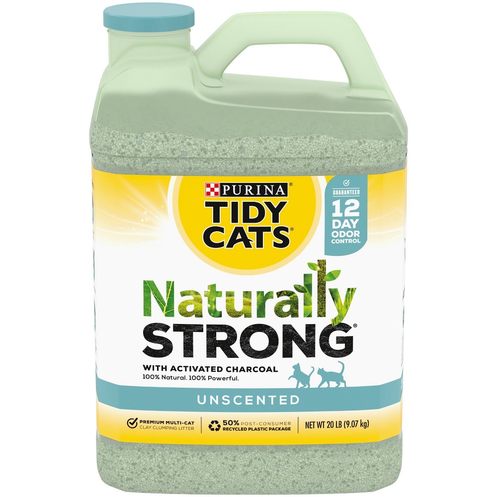 Lock away litter box odors in your multiple-cat home with Purina Tidy Cats Naturally Strong clumping cat litter. This clay kitty litter formula contains activated charcoal that traps odor molecules, delivering powerful natural odor control guaranteed for 12 days when used as directed. In fact, activated charcoal controls odor better than baking soda by volume. The superabsorbent clay granules in this natural litter for cats lock away moisture to help keep your kitty litter box dry and comfortable. Clay also promotes naturally tight clumping for effortless litter box scooping. Purina Tidy Cats unscented cat litter is naturally free of dyes and fragrances, making it a great choice for pet parents who are sensitive to scents. This unscented clay cat litter is also 99.9percent dust free to give you a clean and easy pour. We use 50percent post-consumer recycled plastic packaging for Tidy Cats Naturally Strong litter to support your commitment to a greener, more sustainable living space. Put the trusted power of Tidy Cats on your side with Naturally Strong unscented clumping cat litter from the brand most often rmended and personally used by veterinarians. It's 100percent Natural. 100percent Powerful. Satisfaction guaranteed. Size: 20lbs.