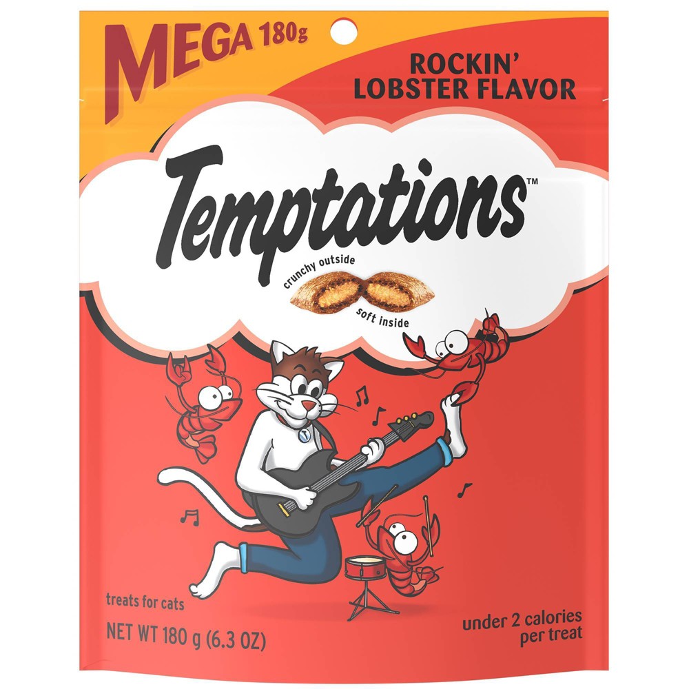 Temptations Rockin' Lobster Flavor Crunchy : Cats can’t resist the delectable taste of TEMPTATIONS, so give your cat these purrfect TEMPTATIONS Classic Cat Treats… they’ll come running the moment you open the pack. Each of these lobster flavor cat treats has less than 2 calories and provides an irresistible combination of both crunchy and soft textures. They also come in a cat-proof, stay-fresh pouch, so your feline friend can enjoy their favorite snack when you open it, but never when they shouldn’t! These TEMPTATIONS Classic Cat Treats are a perfect addition to your cat’s normal feeding routine: Use them as a treat, a meal, or a cat food topper. * Based on 2019 Nielsen sales data Size: 6oz.