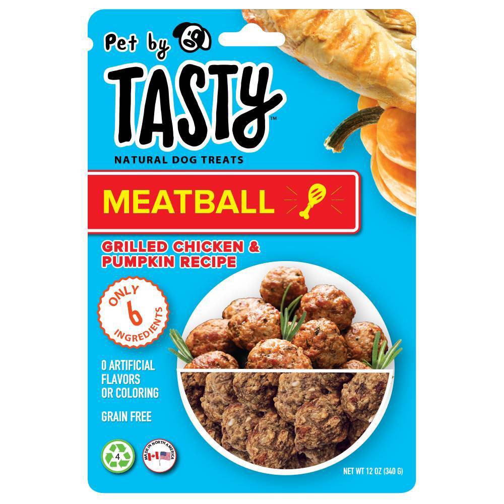 For a treat that's sure to satisfy, Grilled Chicken and Pumpkin Recipe Meatball Dog Treats from Pet by Tasty make a perfect pick. These natural, grain-free dog treats are made in the USA with only 6 ingredients, including real grilled chicken as the first ingredient, along with pumpkin for a satisfying taste that will leave your furry friend begging for more. Their small size makes them great to use as a reward for practicing tricks, to keep your pet occupied or as a special treat between meals, and the natural dog treats contain no artificial flavors or coloring for a treat you can feel good giving them every day. Plus, they come in a convenient 12-ounce reclosable bag to offer easy storage and portability for at home or on the go. Tasty makes cooking fun and easy for millions of people. Like our videos, you'll love to share these Tasty treats with your favorite pup.