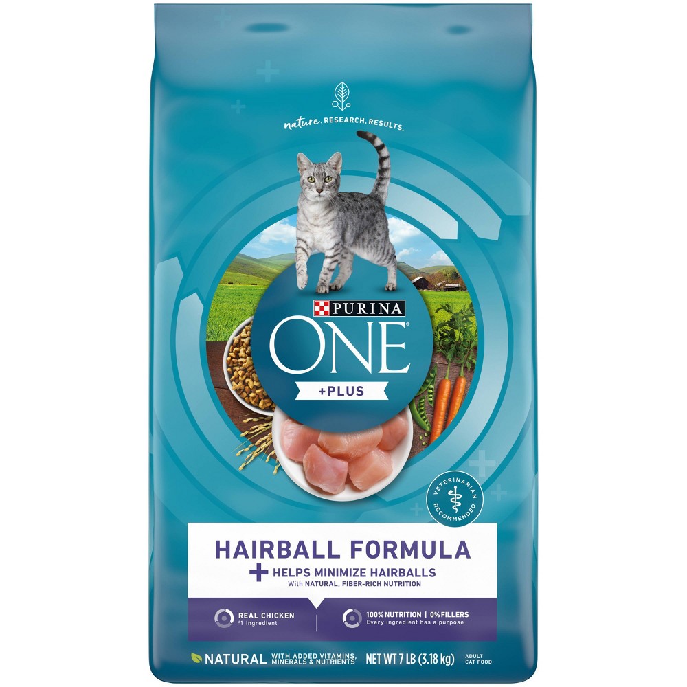 Get results you can see in your cat through the combined power of nature and research in Purina ONE +PLUS Hairball Formula adult dry cat food. Along with a great taste cats love, this easily digestible recipe includes a SmartBlend of high-quality ingredients that get to work in your cat. Driven by nature, the hairball control cat food starts with real chicken as the #1 ingredient and has 38 grams of protein per cup, helping to support her strong muscles, including her healthy heart. A natural fiber-rich blend helps minimize and control hairballs, and four antioxidant sources in this hairball cat food help support her strong immune system. All this wholesome goodness comes together for a natural cat food recipe with added vitamins, minerals and nutrients that delivers 100percent complete and balanced nutrition for your adult cat. With 100percent nutrition and 0percent fillers, every ingredient has a purpose. Our high fiber cat food supplies well-rounded nutrition and is crafted as part of a veterinarian-rmended brand so you can feel confident filling her dish. See the results Purina ONE can make with this +Plus Hairball Formula. Size: 7lb.