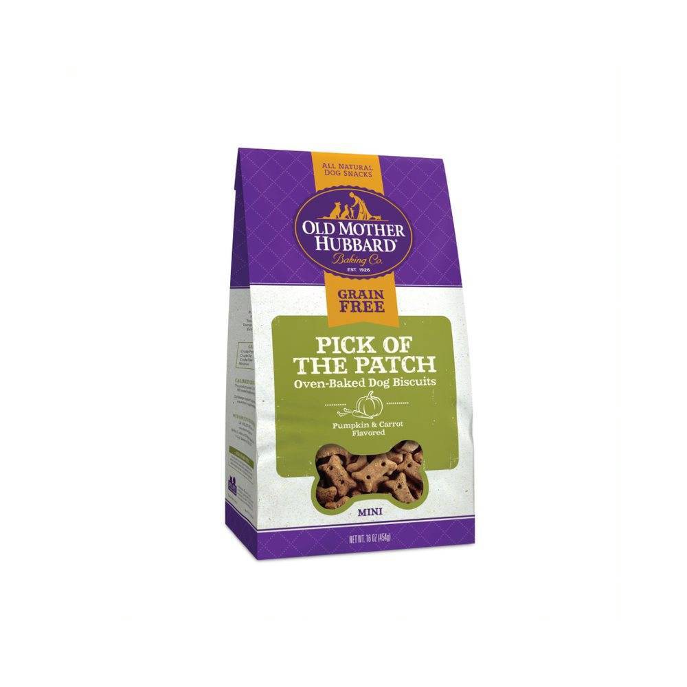 Old Mother Hubbard : If your dog loves the wholesome taste of pumpkin and carrots, then he'll love Old Mother Hubbard Mini Pick of the Patch bone shaped dog treats. For over 90 years, Old Mother Hubbard has been committed to making the most wholesome, all-natural, oven-baked biscuits in all the varieties dogs love to catch, chew and eat. These Grain Free Pick of the Patch natural dog biscuits feature only the best, all-natural ingredients, including pumpkin, carrots, chickpeas for fiber, peas, tapioca flour for a grain-free source of carbohydrates, and also include rosemary and green tea extracts, which are rich in antioxidants, and spearmint extract, which is packed with vitamins and minerals, in a fun dog bone shape with a natural crunch your dog will really enjoy. Dog biscuits, treats and snacks are a great addition to a healthy diet. Snack time is a mutually rewarding show of love and positive reinforcement with your dog. Feel good about training and rewarding your dog with Old Mother Hubbard natural dog treats.