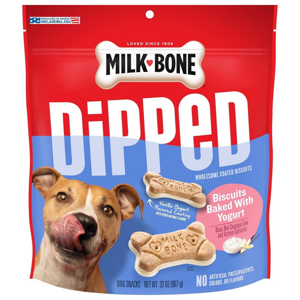 Milk-Bone Dipped Vanilla : Indulge your dog's taste buds with Milk-Bone Dipped Dog Biscuits Baked With Vanilla Yogurt produced in the USA in Topeka, Kansas. These dog biscuits are baked with vanilla yogurt on the bottom to give your dog a little something extra to enjoy. Milk-Bone Dipped biscuits are wholesome dog treats you can feel good about feeding to your dog—they contain no artificial preservatives, colors, or flavors. Treat your four-legged friend to a whole biscuit or break it into smaller pieces for smaller dogs. Order Milk-Bone Dipped Dog Biscuits Baked With Vanilla Yogurt to give your dog a taste of the simple, genuine joy they give to you every day. Size: 32oz.