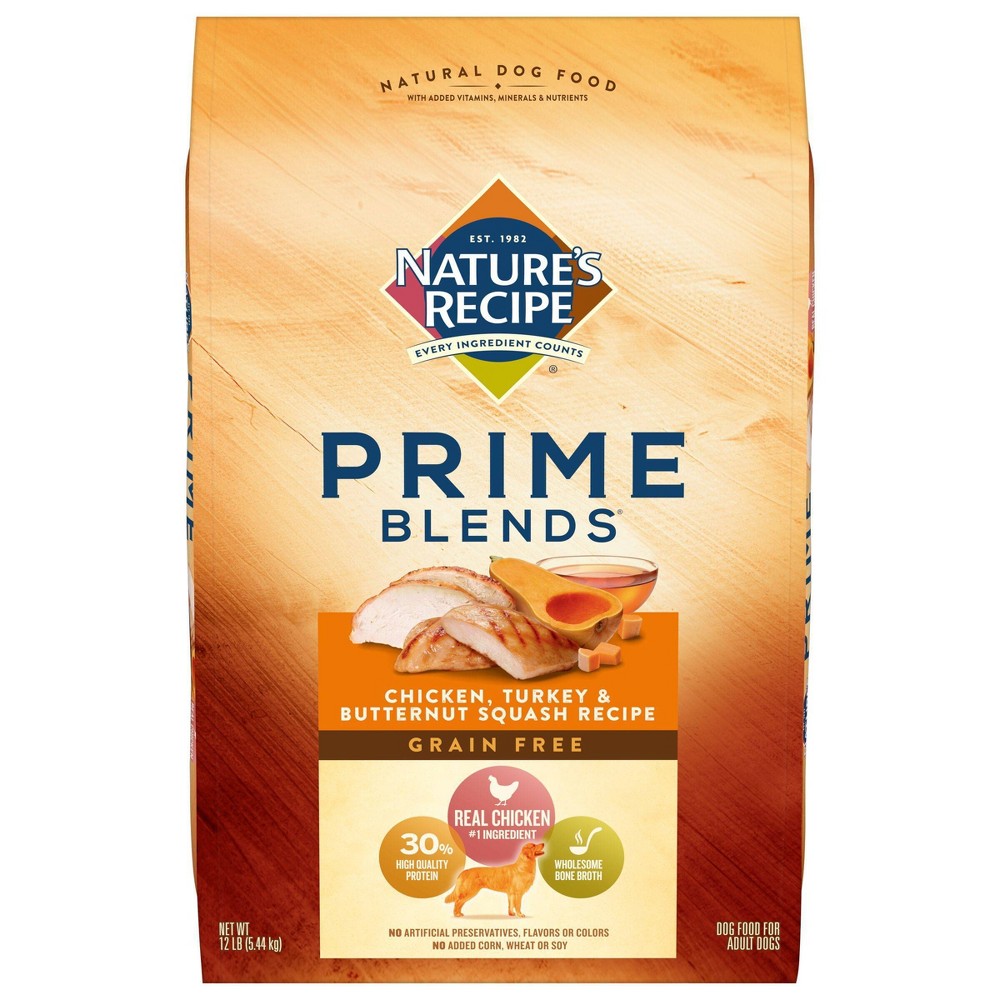 Nature's Recipe Prime : Made with real chicken as the number-one ingredient and real turkey, Nature's Recipe Prime Blends dry dog food provides delicious, poultry-rich nourishment you can feel good about giving your pet. This grain free dry dog food is crafted with added vitamins, minerals, and nutrients and has active antioxidants in every bite to help support your dog's overall health. It is free of artificial flavors, colors, preservatives, corn, wheat, and poultry by-product meal. Size: 12b. Age Group: adult.