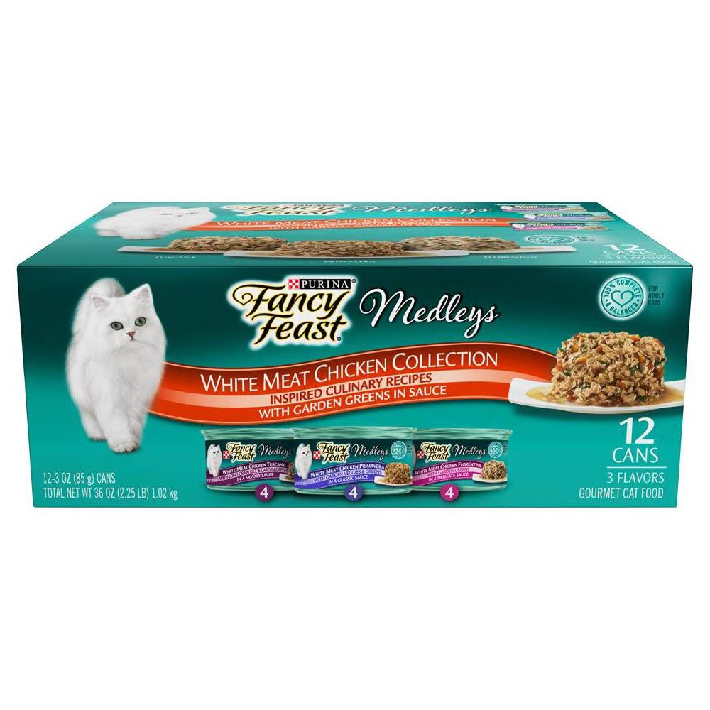 Purina Fancy Feast Medleys : Feed your cat the inspired culinary combination of real white meat chicken, long grain rice, garden greens and veggies covered in a delicious, delicate sauce when you open a can of Purina Fancy Feast Medleys White Meat Chicken Recipe Variety Collection wet cat food. Created with discerning cats in mind, this exceptional, high-quality cat food has the tasty texture cats love and an artful blend of ingredients that keeps them coming back for more. The difference is in the details when you dish out this pet-pleasing concoction destined to be a daily favorite. Each easy-to-open can offers 100percent complete and balanced nutrition for adult cats. Watch your favorite feline lick her lips when you peel back the convenient pull-tab top. Choose from Chicken Florentine, Tuscany or Primavera blends to keep even a picky eater on top of her game as you do your best to satisfy your cat and give her what she needs.