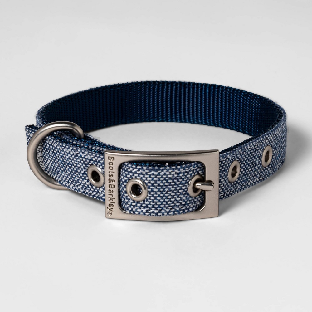 Metal Buckle with Adjustable : Add a dash of style to your pup's look with the Metal Buckle with Adjustable Dog Collar from Boots and Barkley™. This dog collar features an adjustable design with a metallic pin buckle closure and a classic D-ring, offering them a comfortable and adjustable fit while providing you with a convenient attachment point for leash, tags or charms. The blue tweed design and solid metallic attachments lend a classy look, and the allover fabric construction allows for comfy, all-day wear. Suitable for dogs of all ages, it easily holds up to 10 pounds. Loving your pet from head to tail.™ 100percent satisfaction guaranteed or your money back. Size: XL.