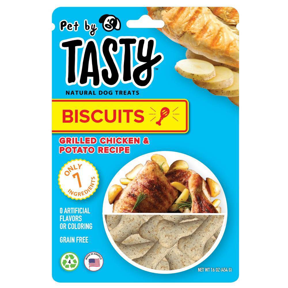 For a delicious, crunchy biscuit you can feel good about feeding your furry friend, look no further than these Crunchy Grilled Chicken and Potato Recipe Dog Treats from Pet by Tasty. Made with chicken as the #1 ingredient, these grain-free natural dog treats pack a delicious grilled chicken and potato flavor and a crunchy texture your pup will love chowing down on. Great for training rewards, occupying your pet and just offering a tasty snack to your canine bestie, these crunchy chicken treats are made with no artificial flavors or coloring and have only 7 total ingredients. Plus, they come in a convenient reclosable 16-ounce bag so it's easy to keep treats on hand anytime. Tasty makes cooking fun and easy for millions of people. Like our videos, you'll love to share these Tasty treats with your favorite pup.
