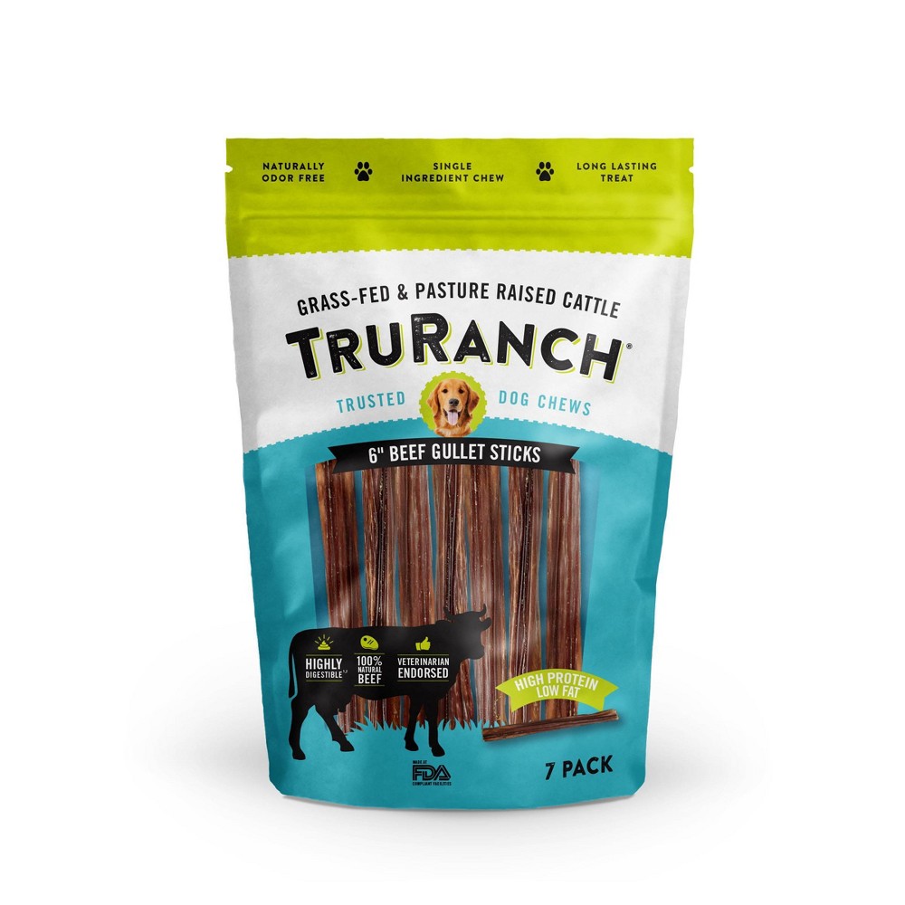 Looking for a natural, long-lasting rawhide alternative for your furry companion? Bark - no more! Grab some TruRanch 6" Beef Gullet Sticks. These tasty sticks are packed with protein and made with only 1 ingredient - beef gullet from grass-fed, pasture raised cattle. Each stick is easy-to-digest and is examined carefully to ensure ideal length, texture and thick-ness for a paw-sitively perfect treat. Reward your favorite pup with a treat free of artificial colors, flavors or preservatives, and free of hormones, grains and chemicals!