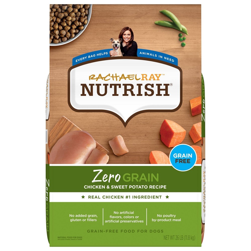 Give your dog a zero-guilt meal they’ll love with Rachael Ray Nutrish Zero Grain Chicken and Sweet Potato Recipe. This grain-free dry dog food is made with real chicken as the #1 ingredient to delight your dog with tasty chicken in every bowl. We also added vitamins, minerals and taurine. What didn’t make it into our recipe? Grain, gluten, filler ingredients, poultry by-product meal, artificial flavors, colors or preservatives. Try out Rachael Ray Zero Grain Dry Dog Food to give your dog the wholesome meals they need and the tasty flavors they love. Size: 26lbs.