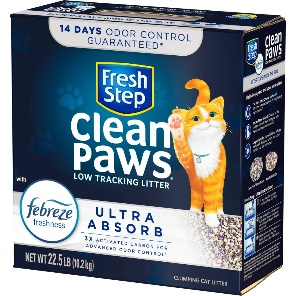 Fresh Step Clean Paws Ultra-Absorb : Fresh Step Clean Paws Ultra Absorb kitty litter has three times the activated carbon for advanced odor control and 14 days of odor control guaranteed. This premium clumping cat litter uses clumping technology for even tighter clumps, leaving fewer stinky crumbles in the litter box and clean paws for your kitty. With 3 times the amount of activated carbon as other formulas and the power of Febreze, Ultra Absorb’s advanced odor control formula absorbs litter box odors continuously so your house stays smelling fresh. Formulated with your cat’s happiness in mind, Fresh Step Cat Litter’s larger, high-quality clay particles are designed with a specific density and shape to stay off your cat’s paws and clump tight, reducing tracking and making scooping easy. This 99.9percent dust free cat litter keeps surfaces cleaner and air clearer. Cleaning the litter box is fast and easy. Just add more litter to your cat’s litter box after you scoop. Certain trademarks used under license from Procter and Gamble Company or its affiliates.