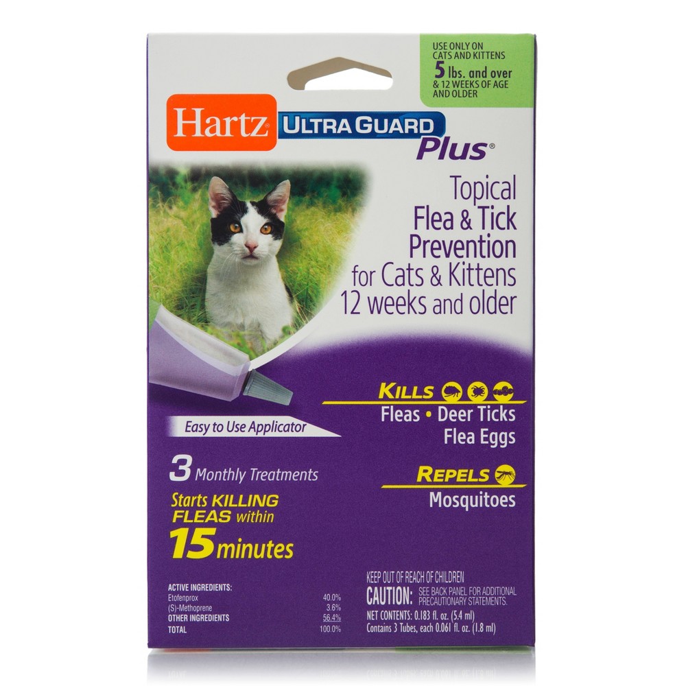 Tell pesky parasites to ‘bug off’ with the Hartz UltraGuard Plus Flea and Tick Treatment for Cats and Kittens. Each convenient and easy to apply, single dose tube kills fleas, flea eggs and deer ticks, stopping the flea life cycle in its tracks. Also repels mosquitoes. Formula stays on and does not rub off. Use only on cats or kittens 5 pounds and over, 12 weeks of age and older. Package contains three applications—a three-month supply. Directions: Remove one applicator tube from package and hold in an upright position away from your face. Pull off cap. Turn the cap around and place on top of tube. Simply press cap down to break the seal of the tube and remove cap carefully. Position the tip of the tube at the base of the pet's back between the shoulder blades and squeeze out the entire contents of the tube to form a stripe as you move from the shoulder blades along the back to the base of the tail. The treated area may appear oily after application. Repeat every month. Consult a veterinarian before using this product on debilitated, aged or medicated pets. If signs of sensitivity occur, bathe your pet with mild soap and rinse with large amount of water. If signs continue, consult a veterinarian immediately.